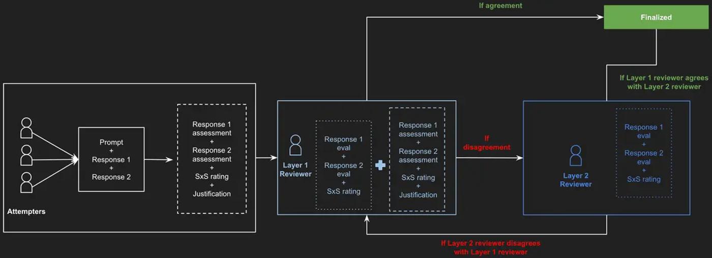 To ensure thoroughness and reliability in the evaluation process, each task was executed in parallel 3 times by different human annotators. Then, the ratings were then reviewed in two stages: an initial review layer and a final review layer. The figure below provides an overview of the evaluation pipeline design. After finalizing the tasks, a team of internal independent auditors randomly selected and reviewed 10% of the tasks for quality control.