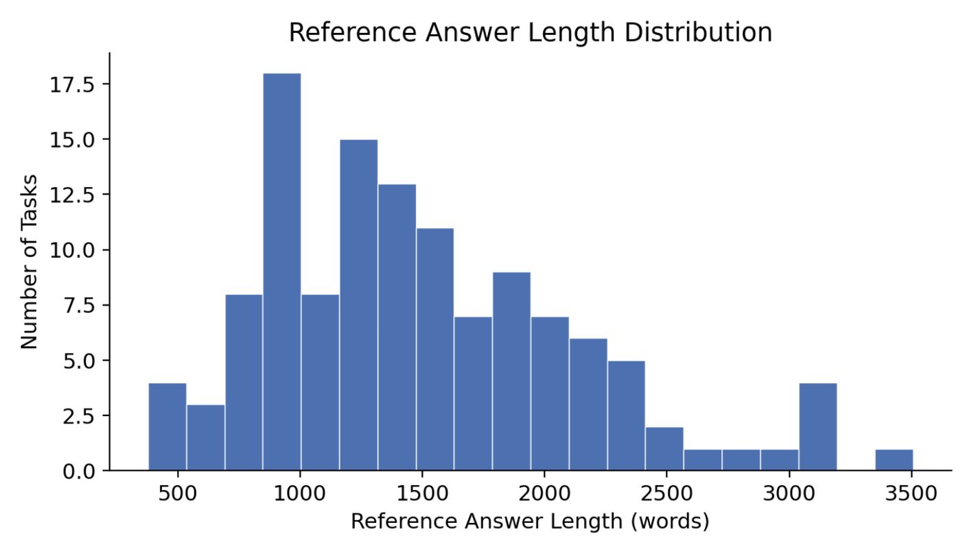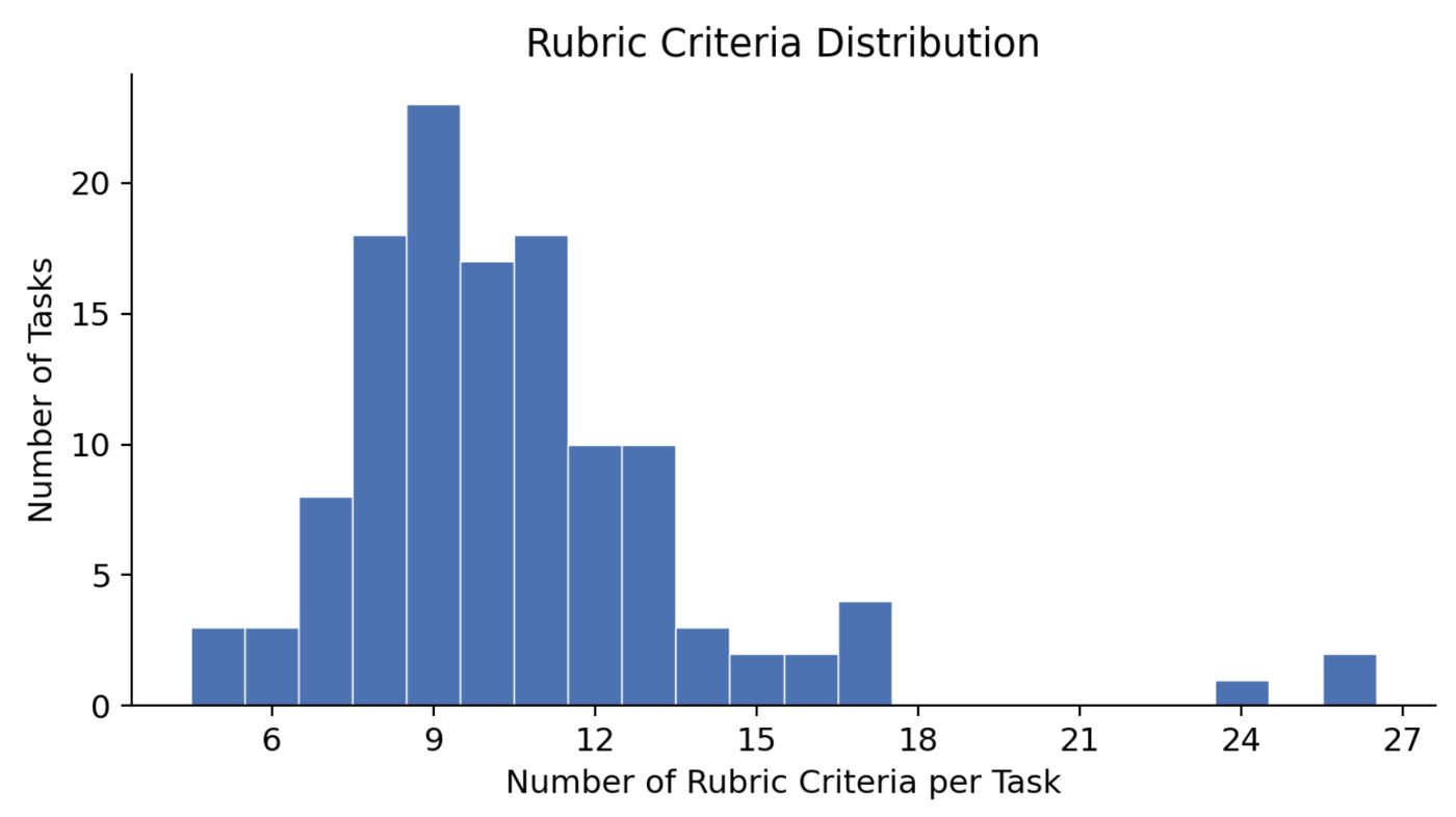 Rubric Construction. For each question, human experts define a structured rubric of evaluation criteria (average: 12.3 per task). Each criterion is a specific, verifiable factual claim that a correct answer must contain. Rubrics follow standard design principles: specific (with no or little room for interpretation), atomic (testing one distinct aspect), self-containment (gradable without external knowledge).