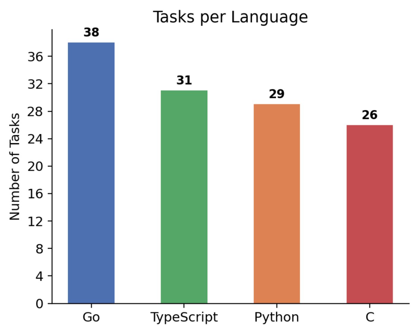 The benchmark consists of tasks drawn from 11 production repositories across 4 programming languages – Go, Python, C, and TypeScript. Top models achieve a 30% pass rate (at the strictest rubric threshold of 1.0), indicating substantial room for improvement.