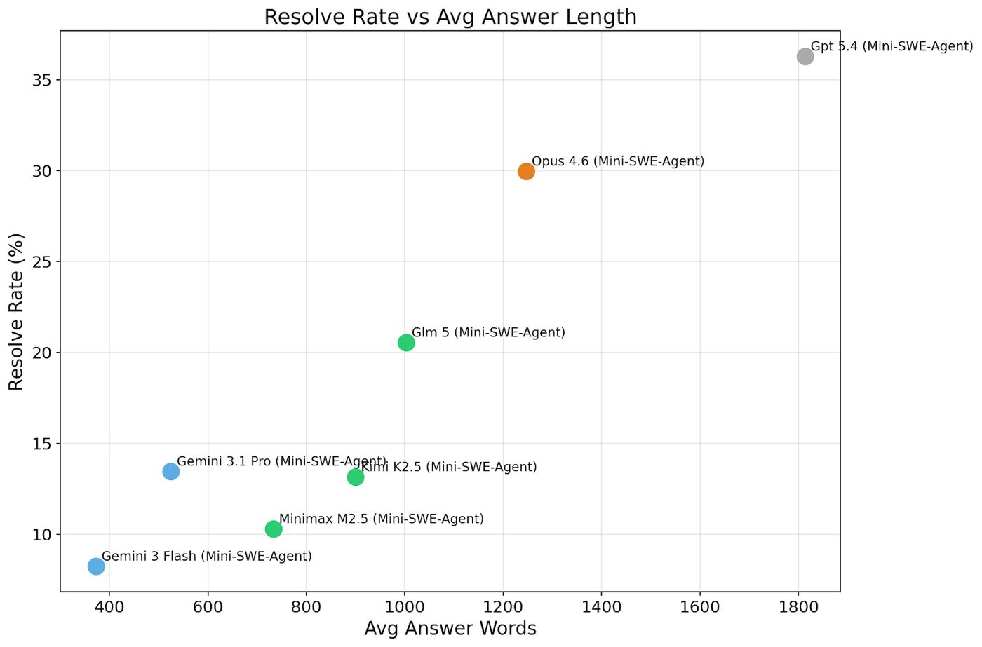 Top models consistently produce longer answers (>1200 words). There is a positive correlation between a model’s answer length and its resolution rate.