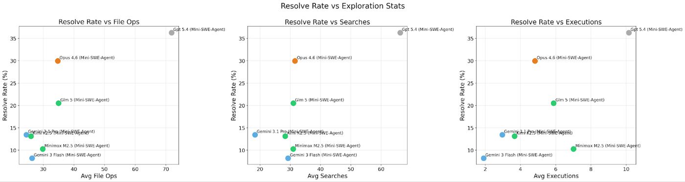 Beyond the raw resolve rate, we see several interesting patterns in the behavior of frontier models.