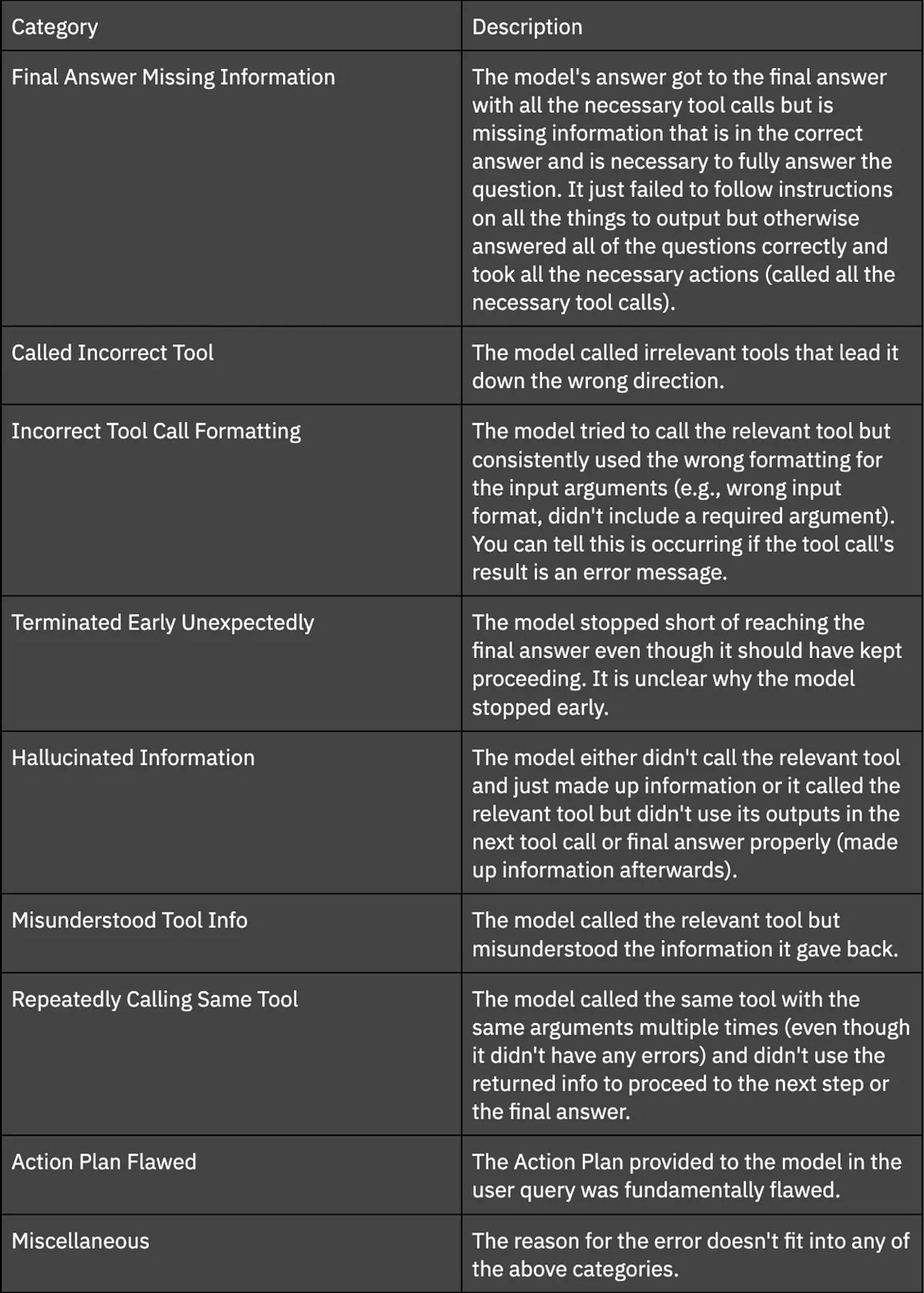 For the avoidance of doubt, the evaluated model is what generates the high level action plan, performs native function calling, and derives the final answer. The grading model (GPT-4 Turbo in our case), is then used to evaluate the model’s output by comparing it against the ground truth answer.