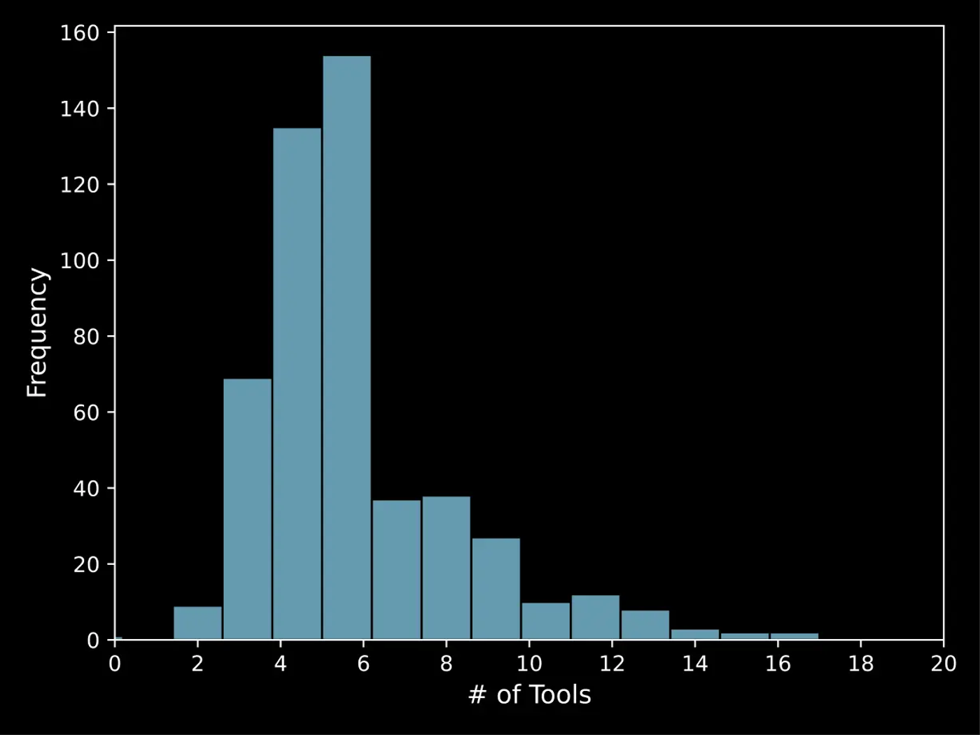 Figure 6. About 85% of prompts in ToolComp require at least three tools to solve, indicating that they have a decent amount of complexity and difficulty. Furthermore, ~20% of prompts still require seven or more tool calls to solve. This indicates that an agent being evaluated on this benchmark requires high context length, sophisticated reasoning over long context, and advanced tool calling capabilities in order to process long tool chains, formulate a high level plan, and understand the outputs of each tool call to proceed to the next step and subsequently achieve a high score.