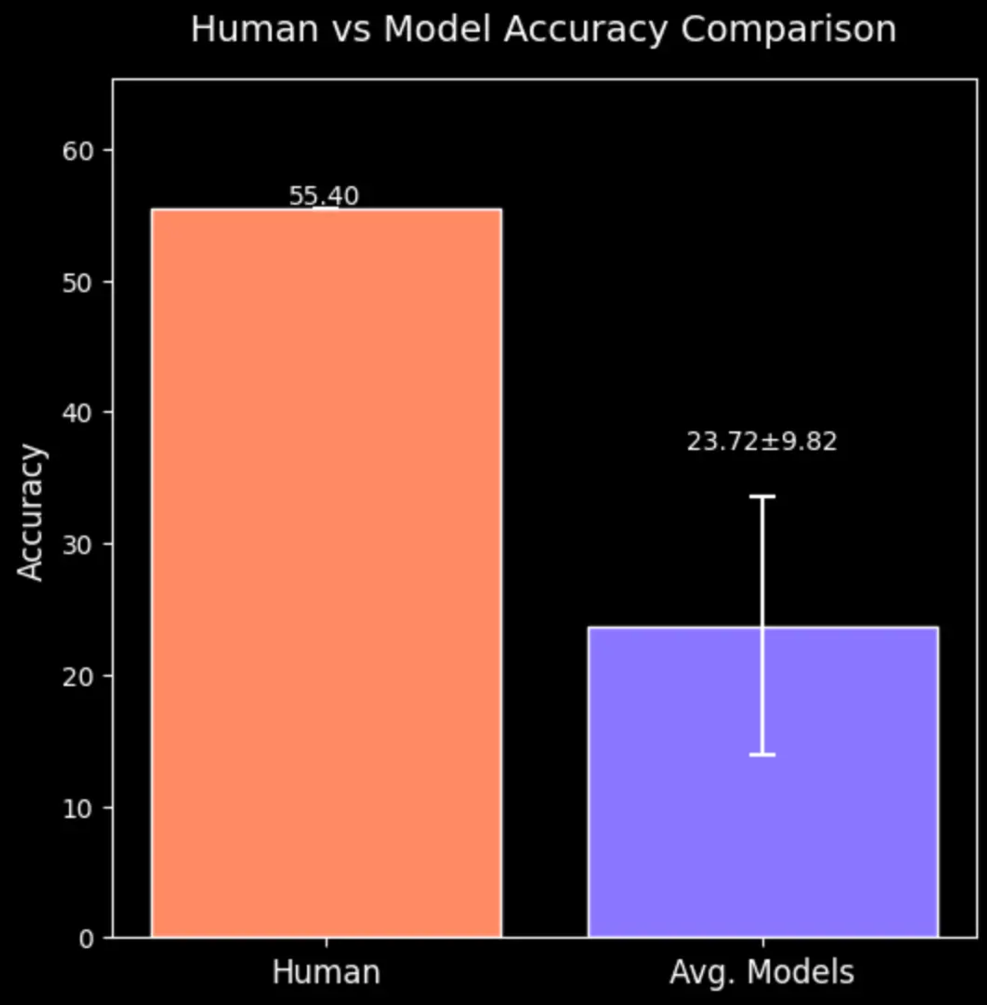 To prioritize accuracy over explanation, participants were asked to provide only their final answers within the time constraint, without requiring detailed reasoning. The study revealed a human accuracy rate of 55.40% across all tasks. When compared to the average performance of models currently on the leaderboard (see Figure 8), the results expose a substantial gap between human and model capabilities in visual reasoning tasks, highlighting significant room for improvement in current systems.