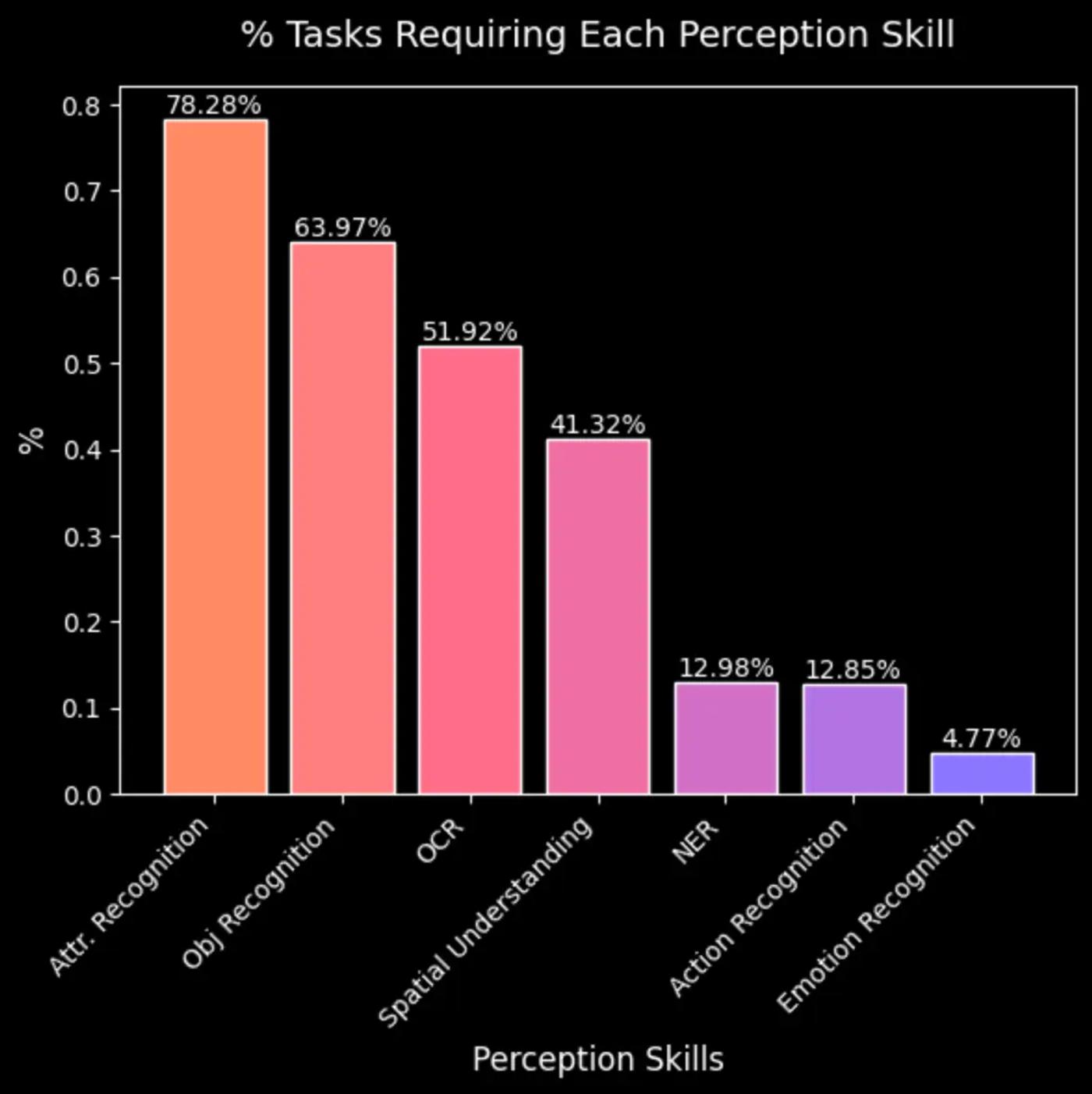 In designing the tasks, we initially created a balanced distribution of required perception skills across prompts. While annotators were given this foundation, they had the flexibility to change and incorporate additional perception skills as needed. Our analysis revealed that the most frequently required perception skills in VISTA's visual reasoning prompts are: attribute recognition, object recognition, Optical Character Recognition (OCR), and spatial understanding.