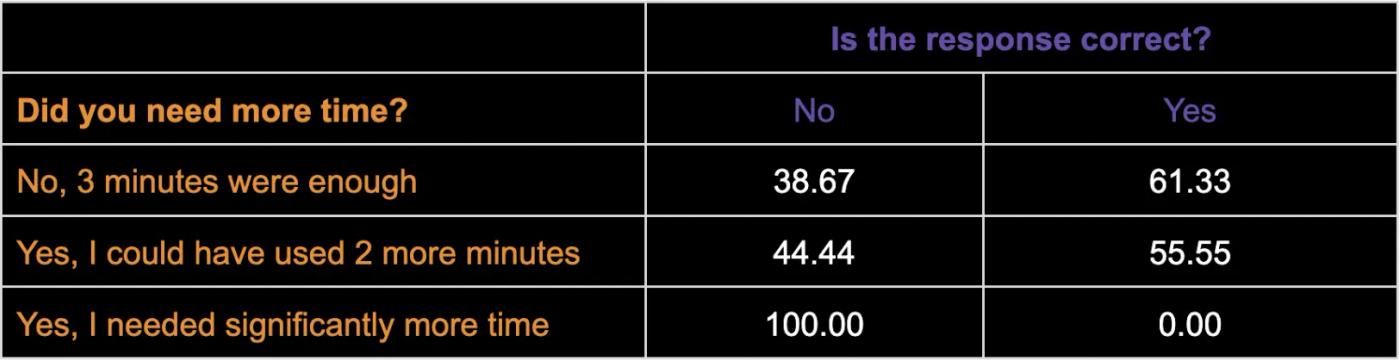 Table 2. Response accuracy percentages categorized by participants' assessed time needs for task completion.